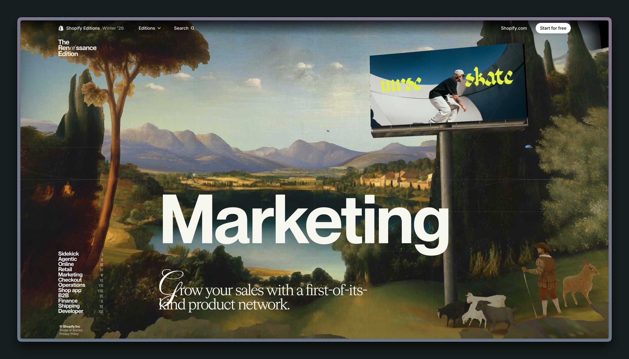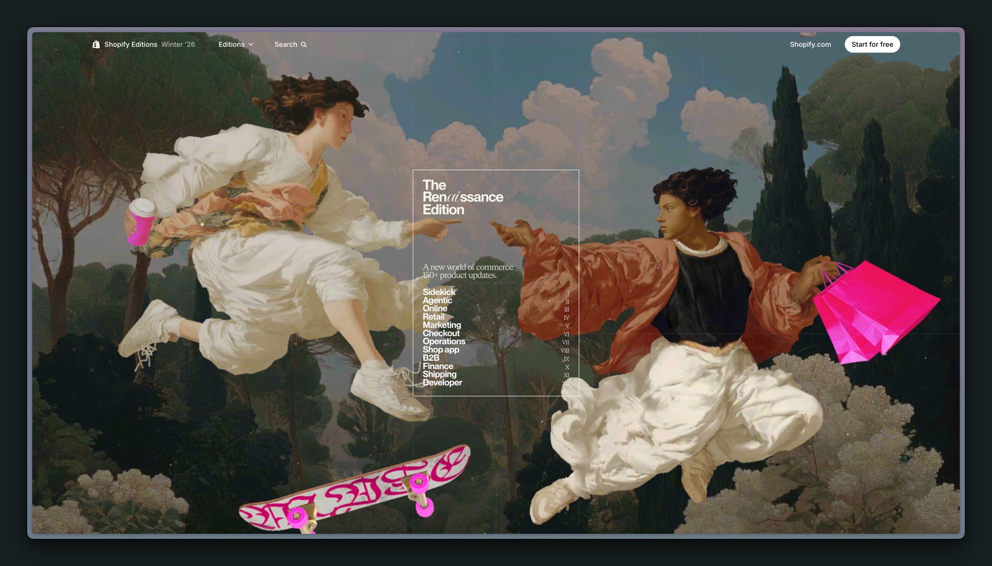一打开网页首屏,复古配色、油画风格插图和罗马数字等等,文艺复兴的味道扑面而来,而滑板、购物袋和纸杯这些现代要素,很明确表达了这个网页的主题是古典和现代的结合。