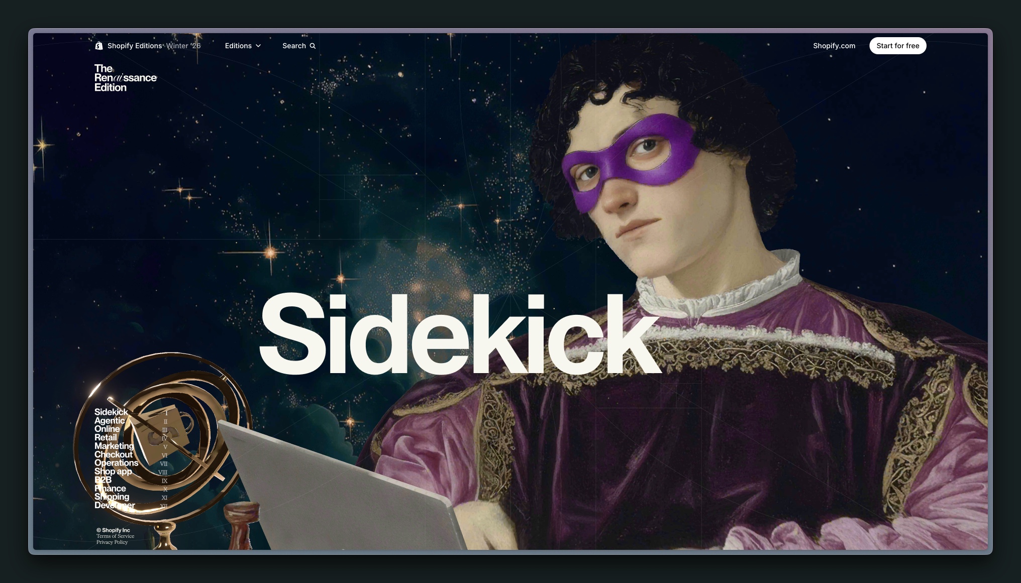 左下角天体仪上的中心,换成了 Shopify 的 Logo。这个类似的做法还出现在笔记本电脑 Logo 等位置,这些类似的细节后面不重复说了。